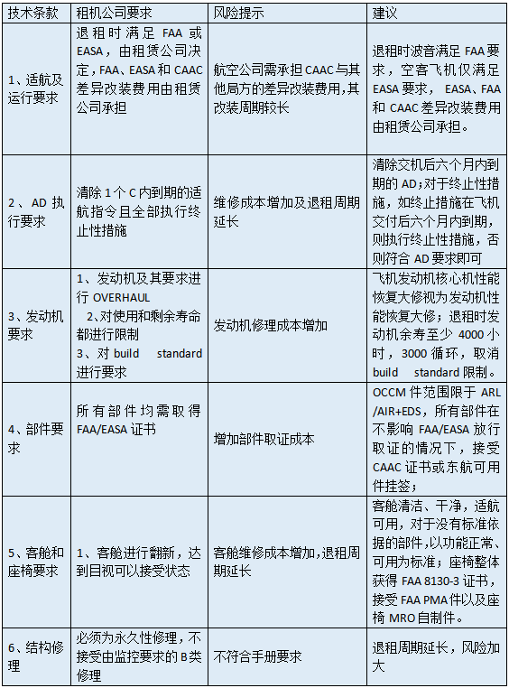 由于经租飞机租期一般较长(较短的也有6-8年时间,较长的租期可以达到17年甚至更长),而在租赁合同中,对于飞机在航空公司运行期间的限制有限,只要飞机正常运行满足CAAC的要求即可,但退租时租赁合同要求普遍高于航空公司运行要求,如果不能在运行时就考虑飞机退租要求,必然造成退租成本增加、退租难度增加。